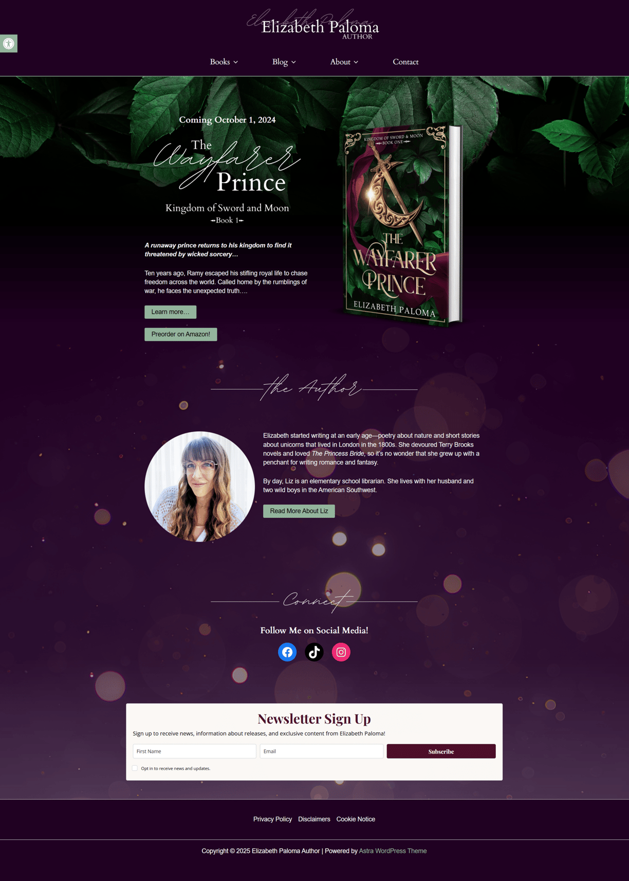 Debut author Elizabeth Paloma needed a website refresh ahead of the launch of her book, The Wayfarer Prince. The book is the first in an exciting romantasy series. With a custom branded website she can promote her books, engage with readers, and publish blogs. This site is live - visit Elizabeth here!